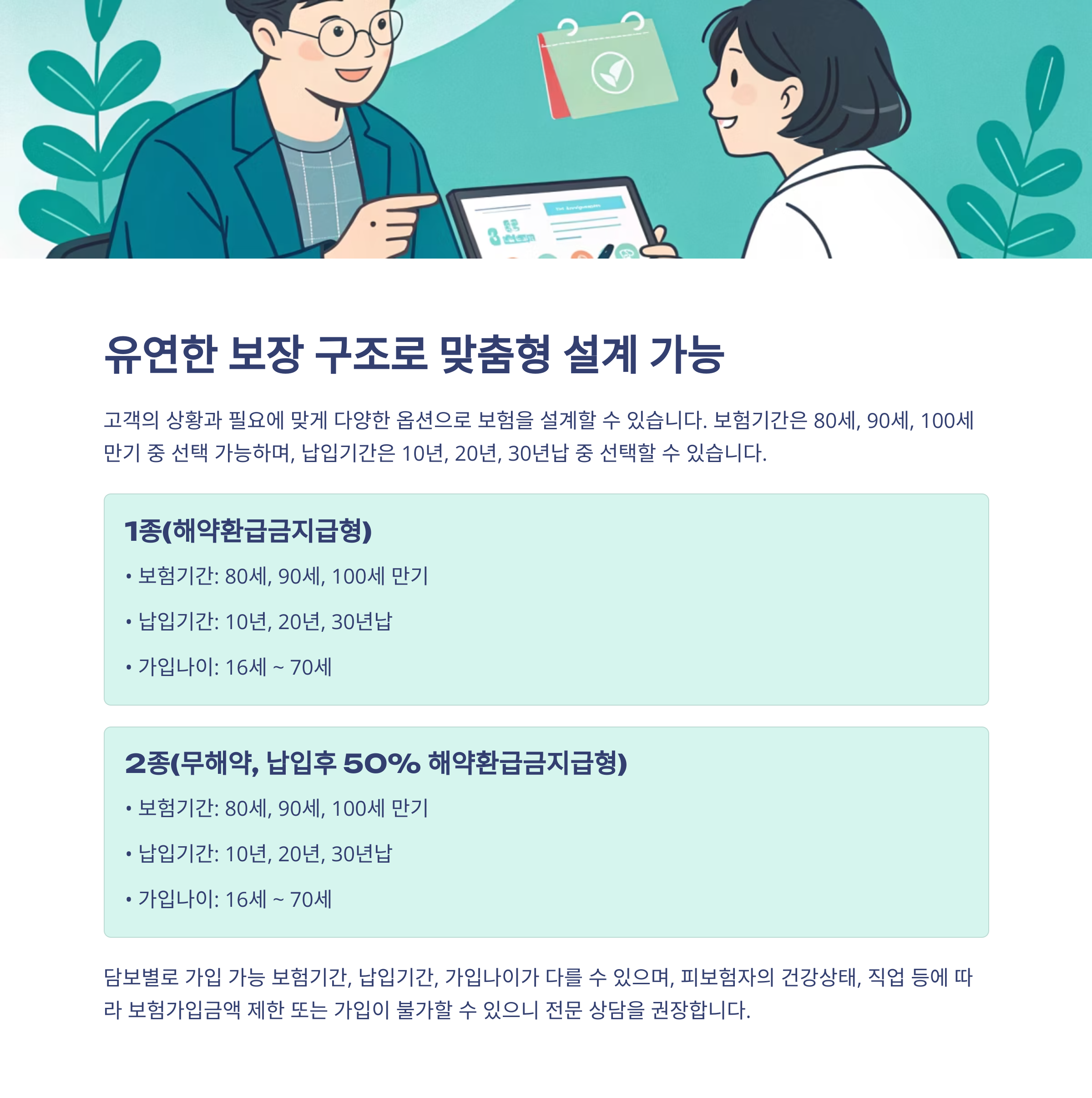 16세부터 70세까지 가입 가능하며, 만기 옵션은 80세·90세·100세 중 선택할 수 있어요.