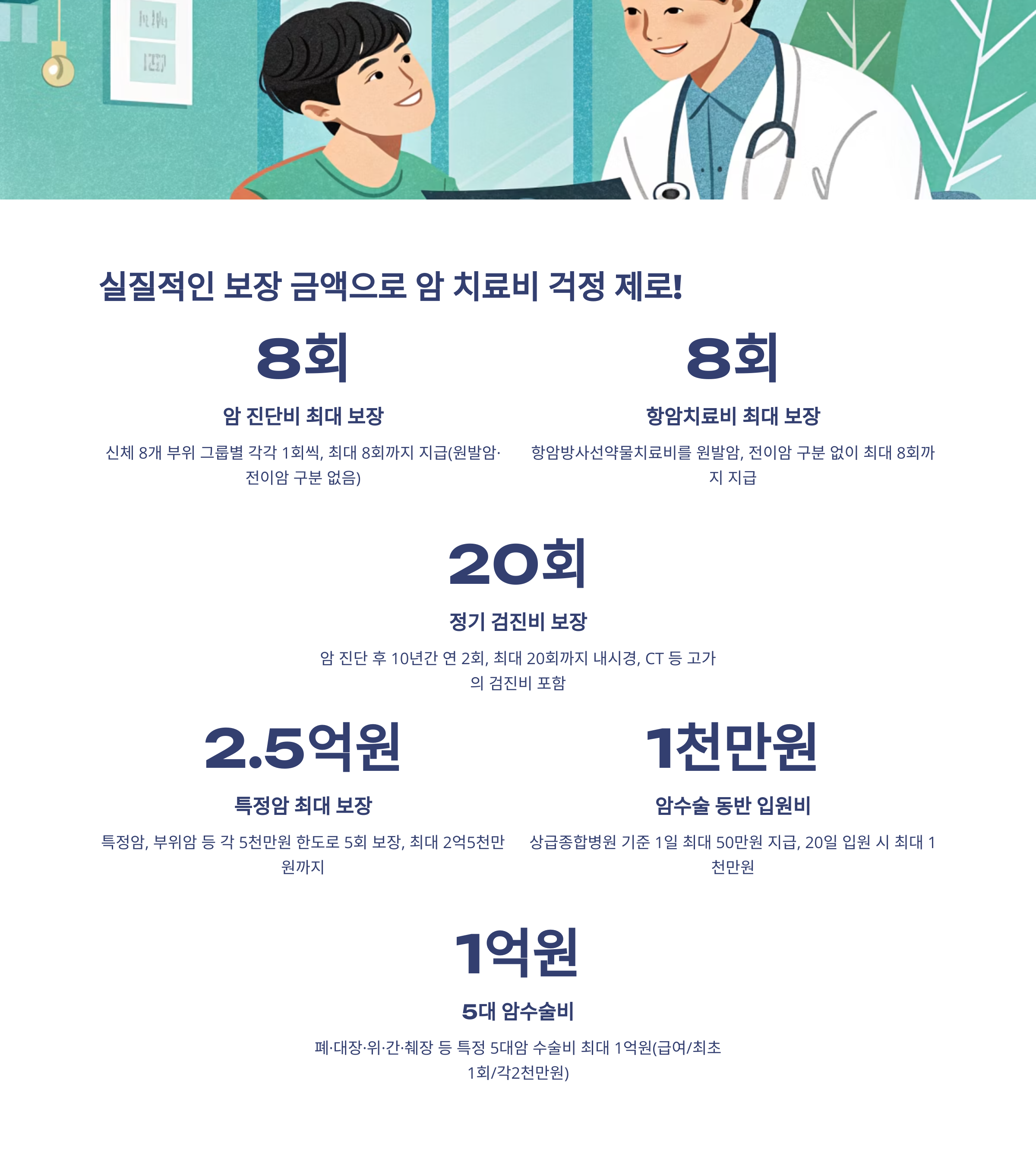 항암 치료는 반복적이고 비용이 큽니다. 최대 8회 보장은 장기 치료 부담을 크게 줄여줘요.