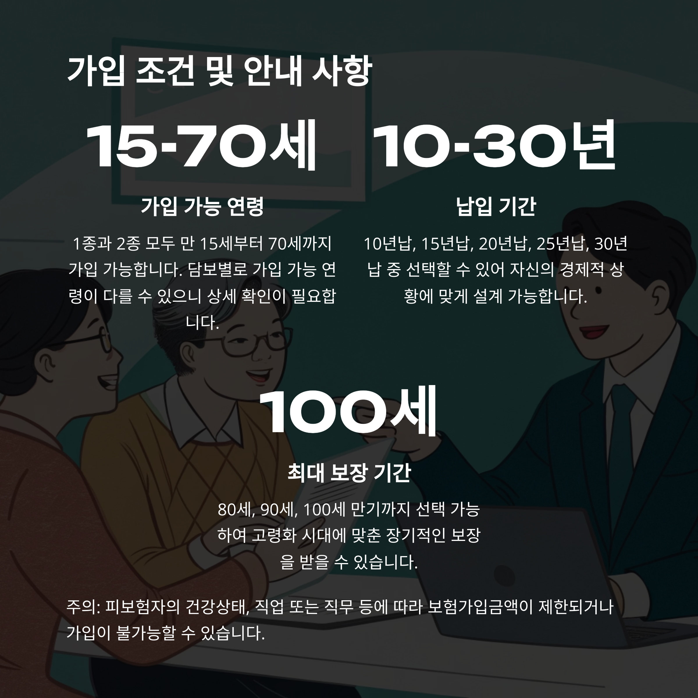 보험은 타이밍이 정말 중요해요. 언제 가입하느냐에 따라 보험료가 크게 달라지죠. 이 상품은 15세부터 70세까지 가입 가능하며, 보험기간은 최대 100세까지 선택할 수 있어요. 보장기간이 긴 만큼, 20년납 혹은 30년납으로 길게 설정하면 장기적으로 안정적이죠.