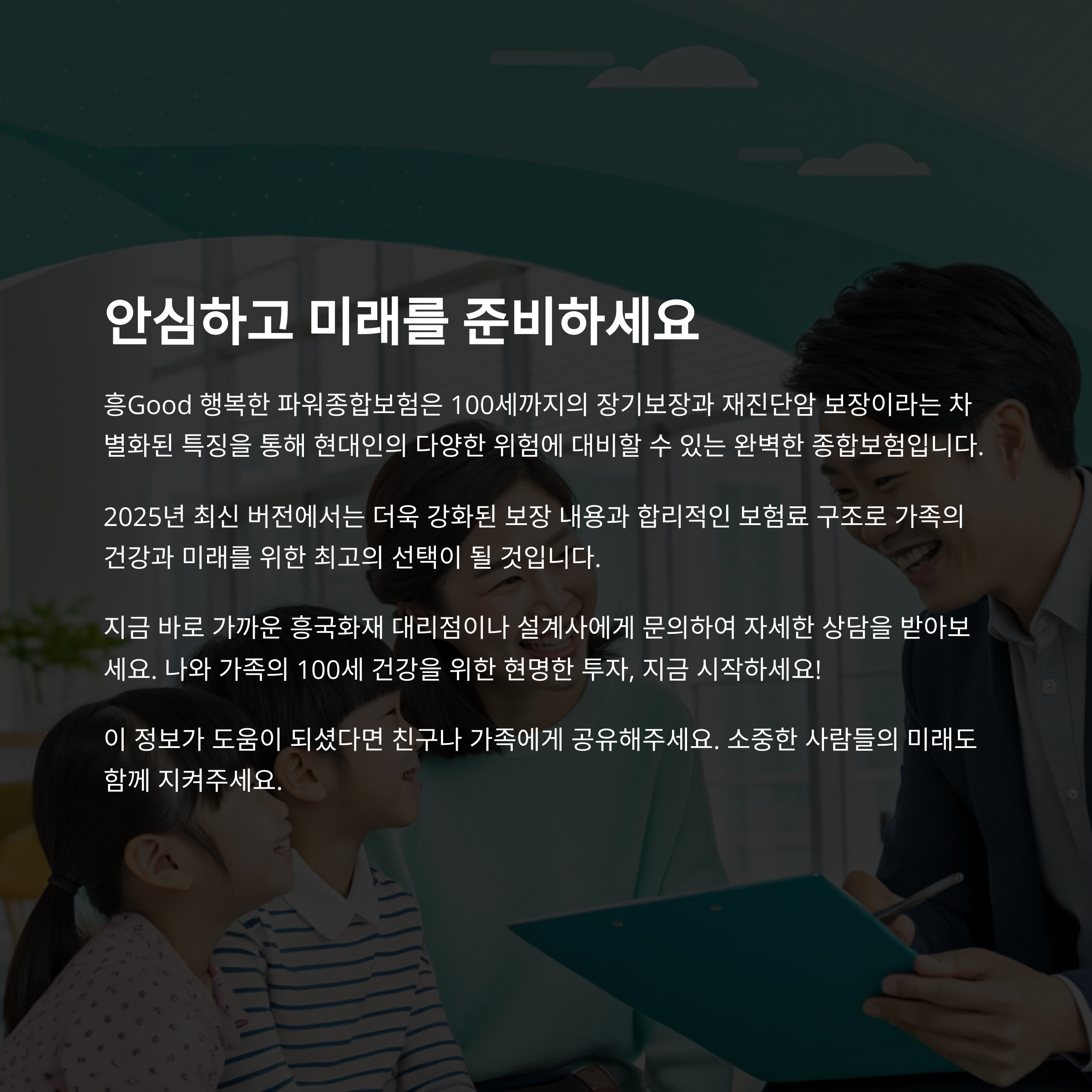 자, 이제 흥Good 행복한 파워종합보험에 대해 어느 정도 감이 오셨나요? 보험이라는 게 숫자와 조건으로만 보면 참 복잡한데, 사실은 우리의 삶과 가장 가까운 ‘보호막’ 같은 존재예요. 누군가에게는 재진단암 보장이, 또 다른 누군가에게는 100세까지의 보장이 정말 필요할 수 있거든요. 지금 이 글을 읽고 계신 여러분이 어떤 상황에 있든, 꼼꼼한 비교와 이해를 바탕으로 현명한 선택 하시길 진심으로 응원합니다. 혹시 궁금한 점이나 공유하고 싶은 경험이 있다면 댓글로 이야기 나눠보아요! 😊