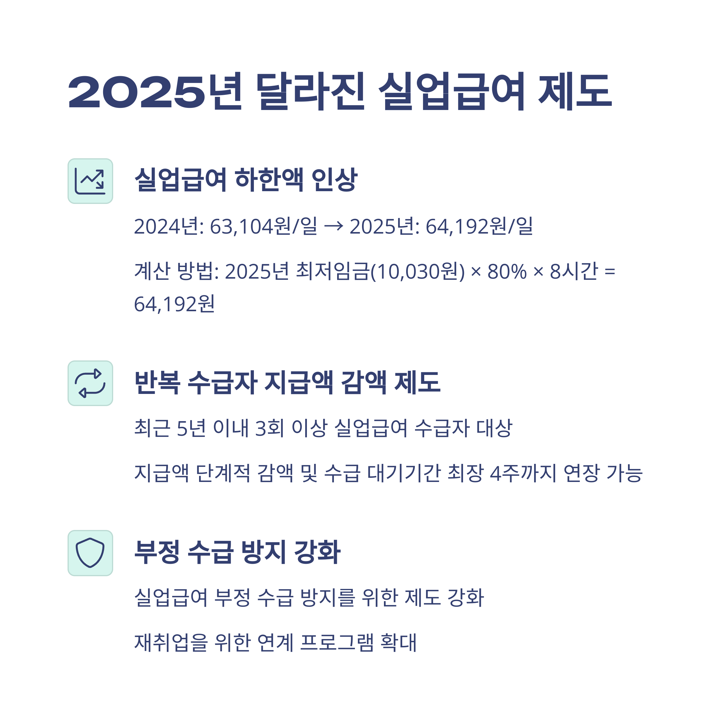 2025년 실업급여 제도에는 몇 가지 핵심적인 변화가 있었어요. 가장 주목할 만한 건 하한액 인상과 반복 수급자 제도 도입인데요, 자세한 변화 내용을 아래 리스트로 정리했어요.