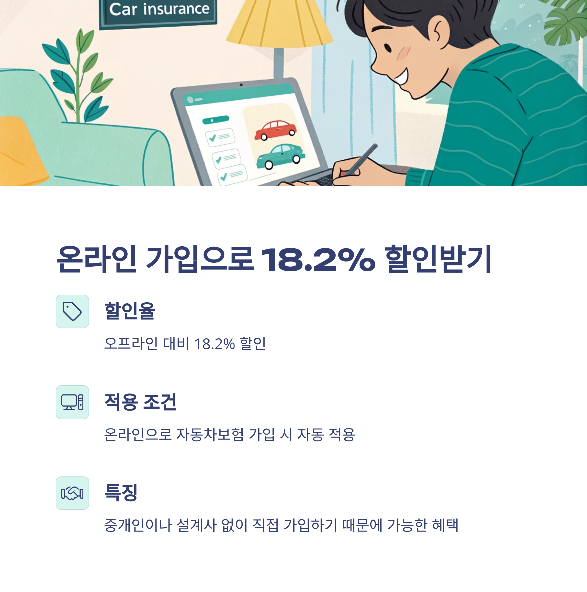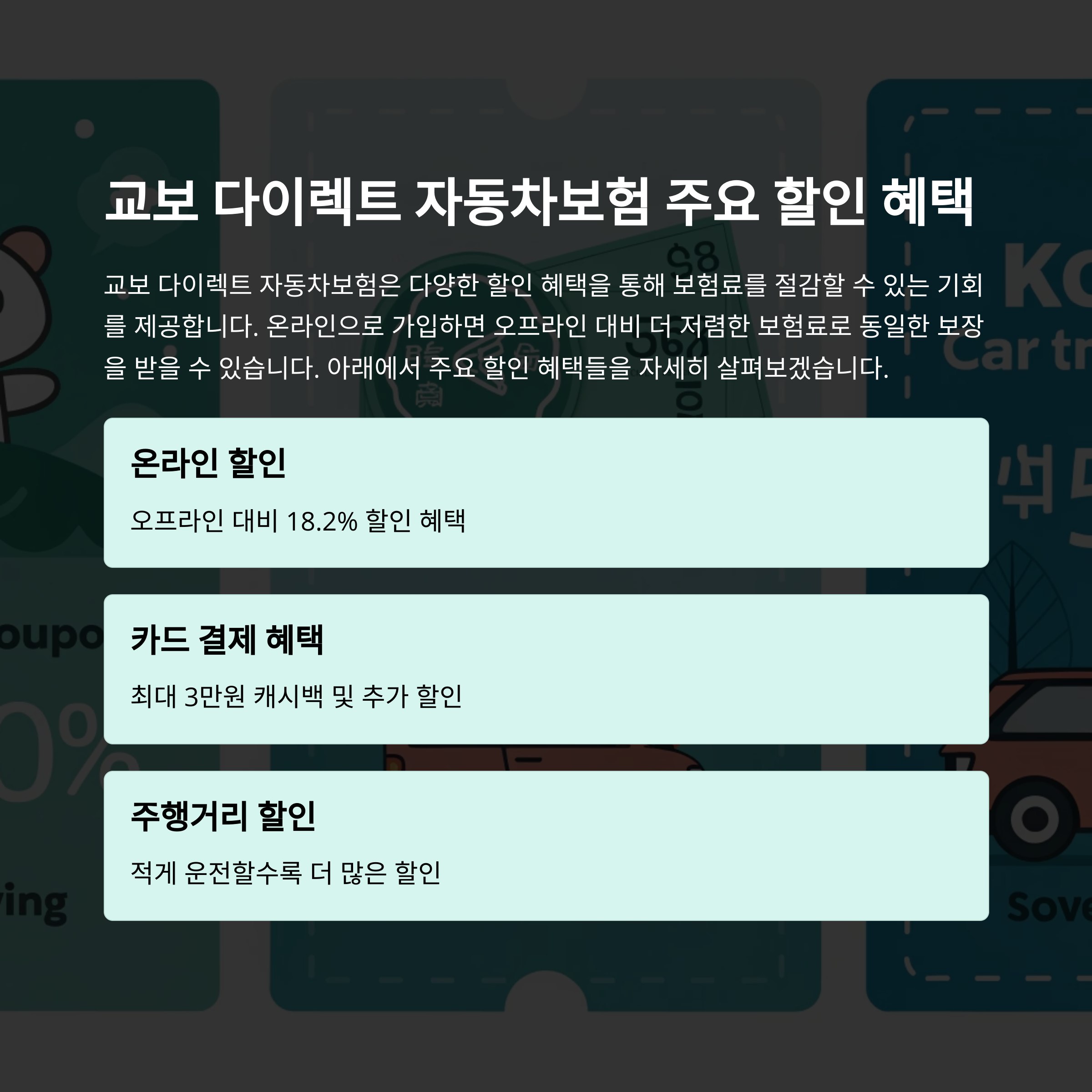 교보 다이렉트 자동차보험이 인기 있는 이유 중 하나는 바로 파격적인 할인 혜택 덕분이죠. 온라인으로만 가입해도 18.2%나 저렴해지니, 이건 솔직히 안 쓸 이유가 없어요. 카드 결제 혜택도 꽤 괜찮고요. 예를 들어 제휴카드로 결제하면 최대 6만 원까지 할인되거나 캐시백을 받을 수 있답니다.
