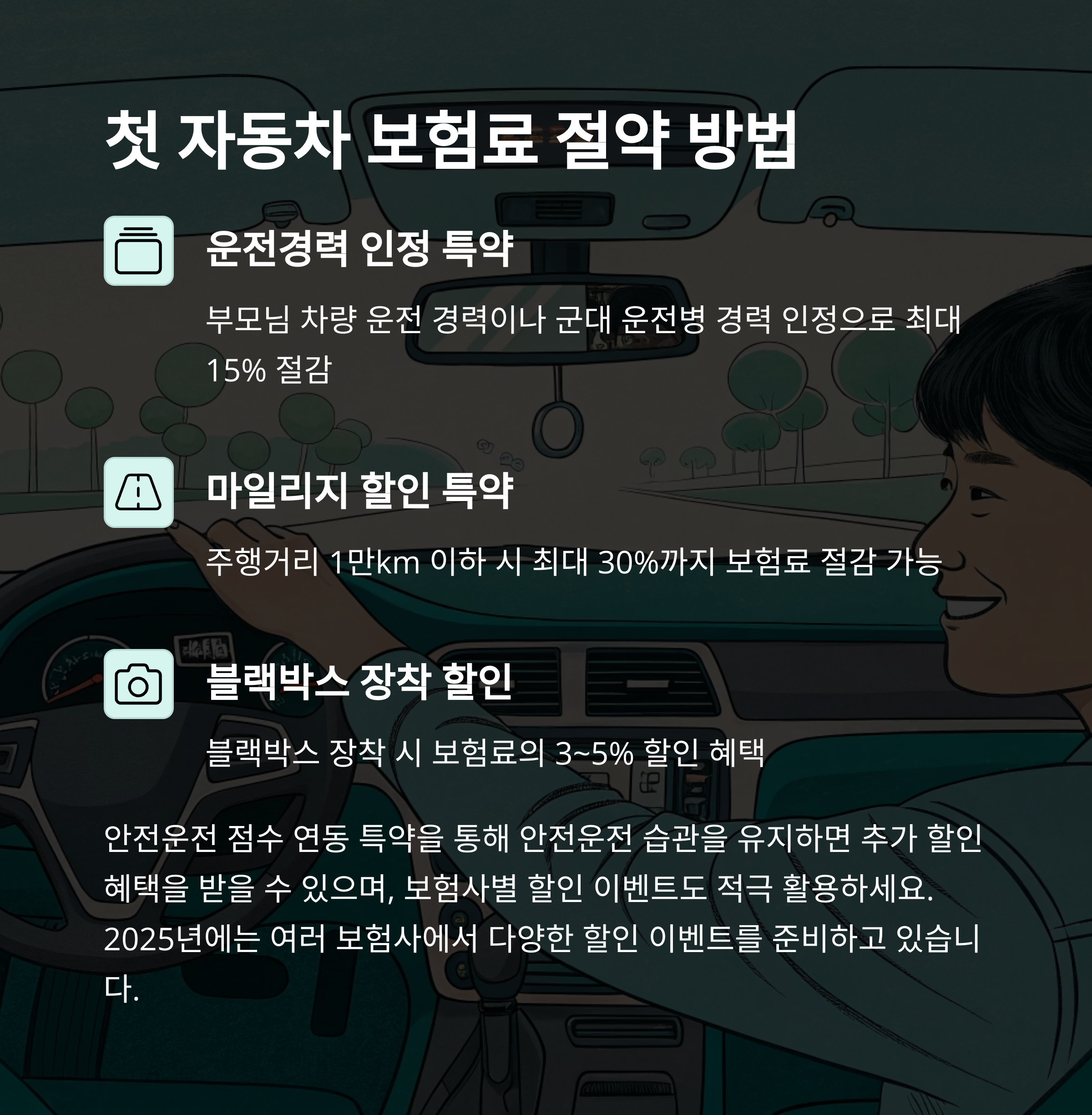 자동차보험, 첫차보험, 2025자동차보험, 보험료절약, 연령별보험료, 초보운전자, 운전경력특약, 마일리지특약, 블랙박스할인, 다이렉트보험
