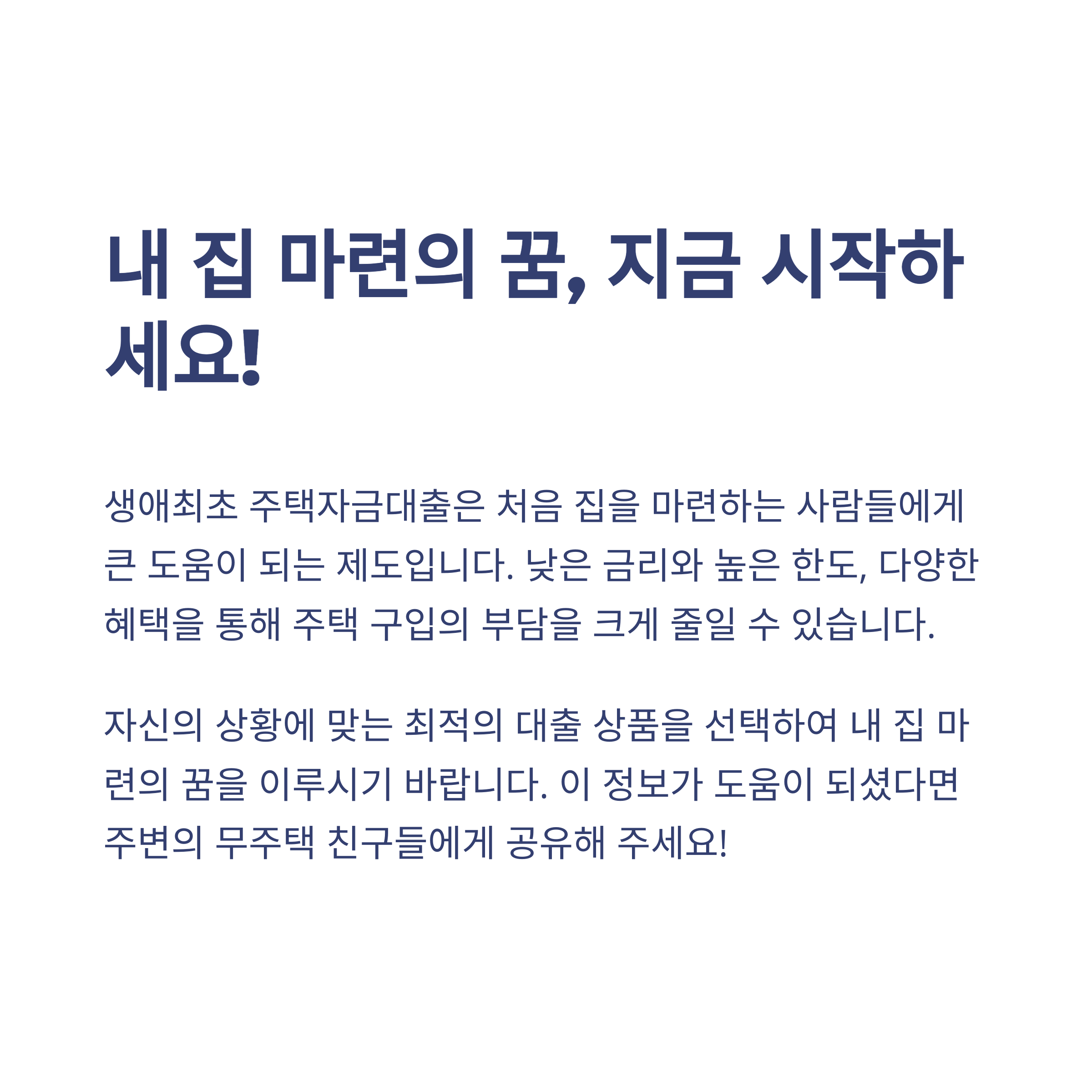 처음 내 집 마련이라는 단어를 들었을 때, 저도 겁부터 났던 기억이 있어요. 하지만 지금 생각해보면 ‘생애 최초 주택 자금 대출’이 있었기에 가능했던 일이죠. 이 글이 여러분의 내 집 마련 여정에 실질적인 도움이 되었길 바라며, 혹시 더 궁금한 점이나 경험 공유하고 싶으신 분들은 댓글로 이야기 나눠봐요. 함께 경험을 나누고, 함께 성장해 나가면 좋겠어요. 언제나 여러분의 ‘내 집 마련’ 응원합니다!