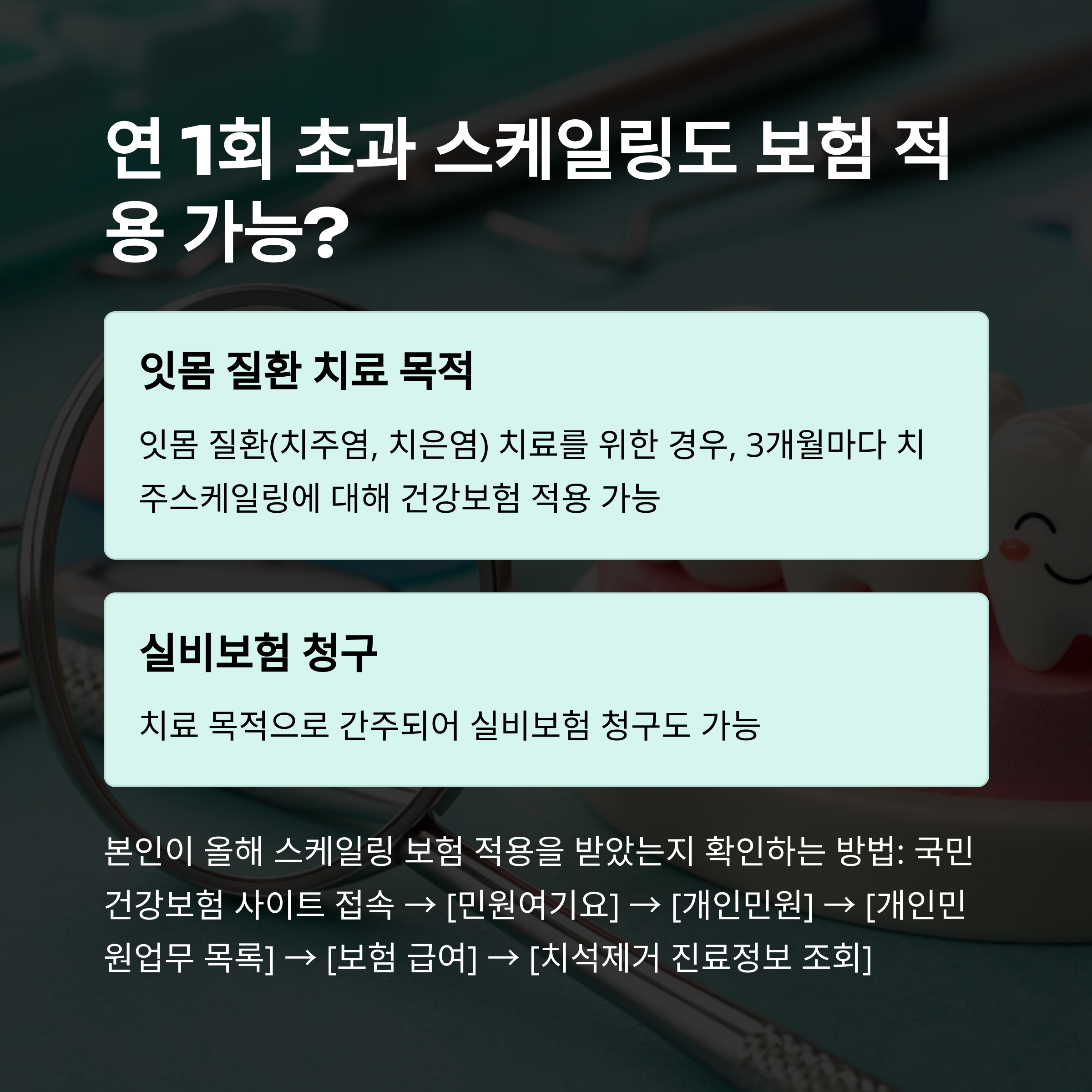잇몸 질환으로 스케일링을 받으면 연 1회를 초과해도 건강보험 적용이 가능하고, 당연히 실비보험 청구도 가능해요. 단, 진단서와 질병 코드가 필요하겠죠?