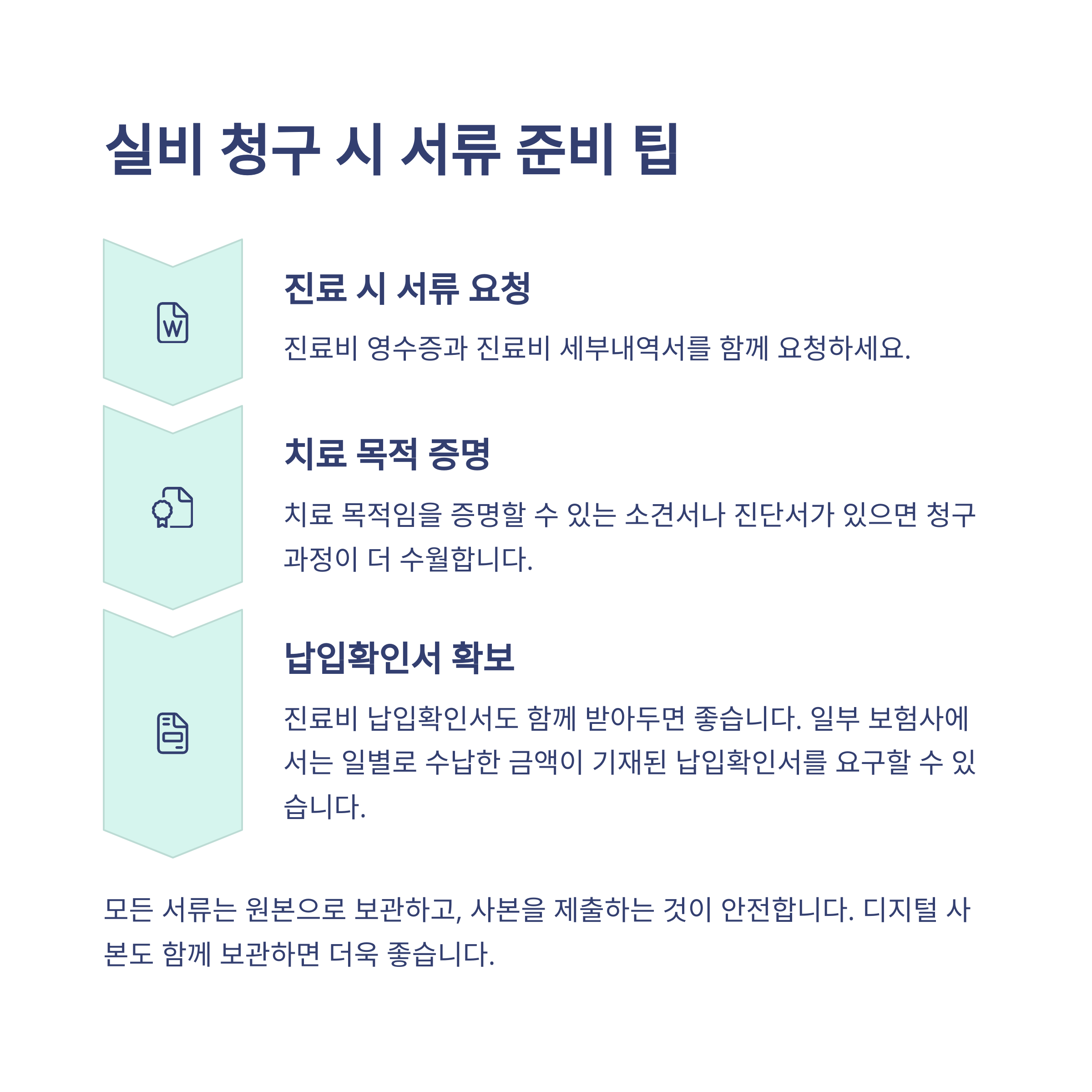진료비 영수증과 진료 세부내역서는 필수입니다. 경우에 따라 소견서나 진단서가 요구될 수 있어요.