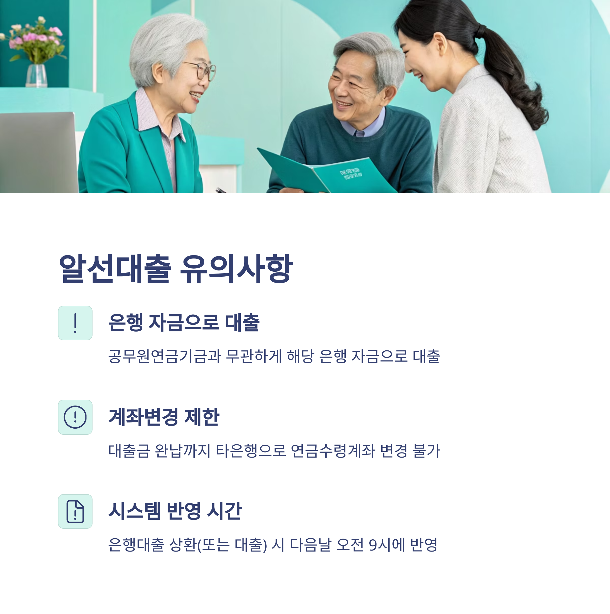 퇴직자는 연금수급자 전용 알선대출만 가능하며, 일반 연금대부는 불가합니다.