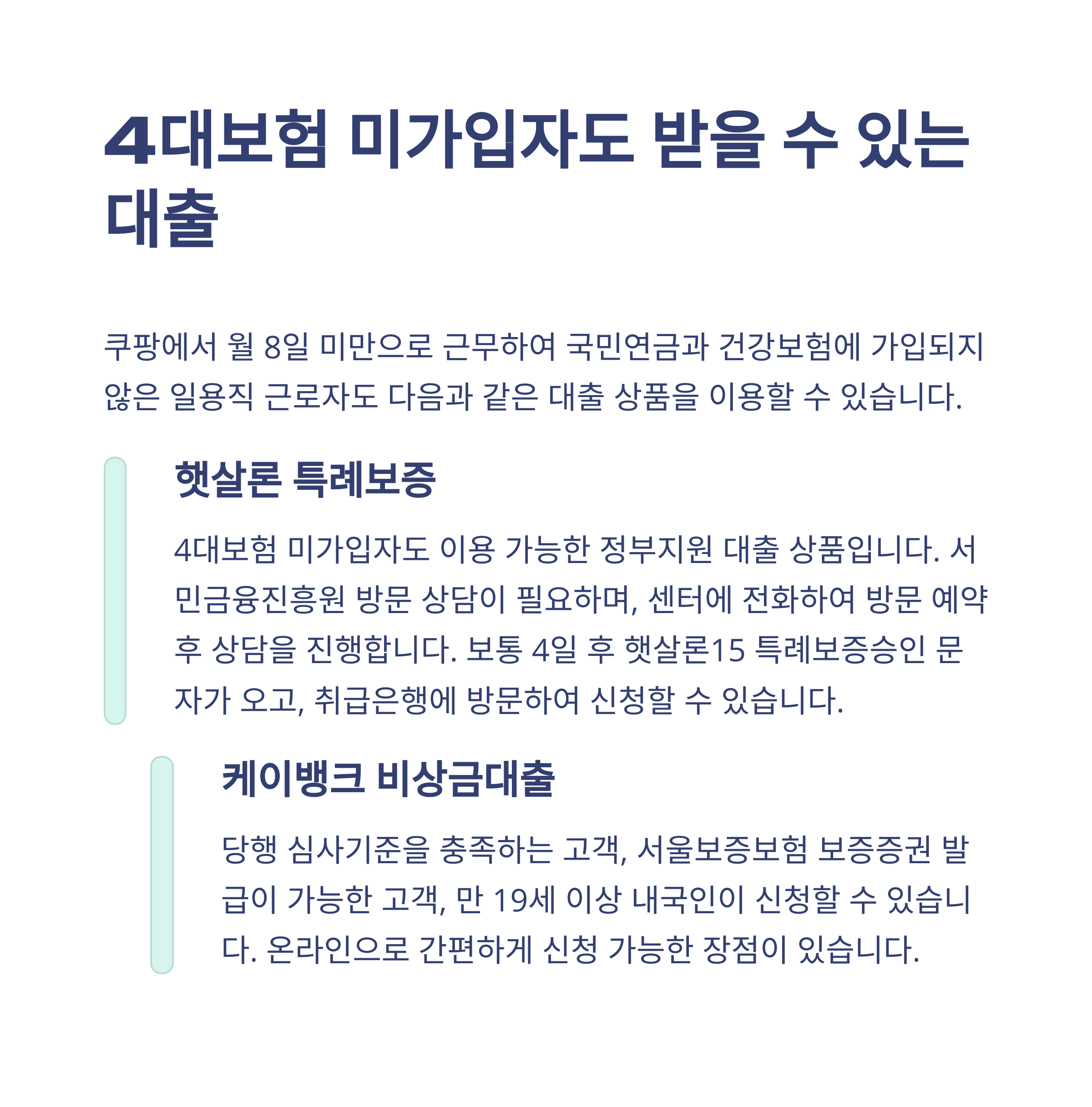 가능합니다. 햇살론 특례보증, 케이뱅크 비상금대출처럼 4대보험 미가입자 대상 상품도 있어요.