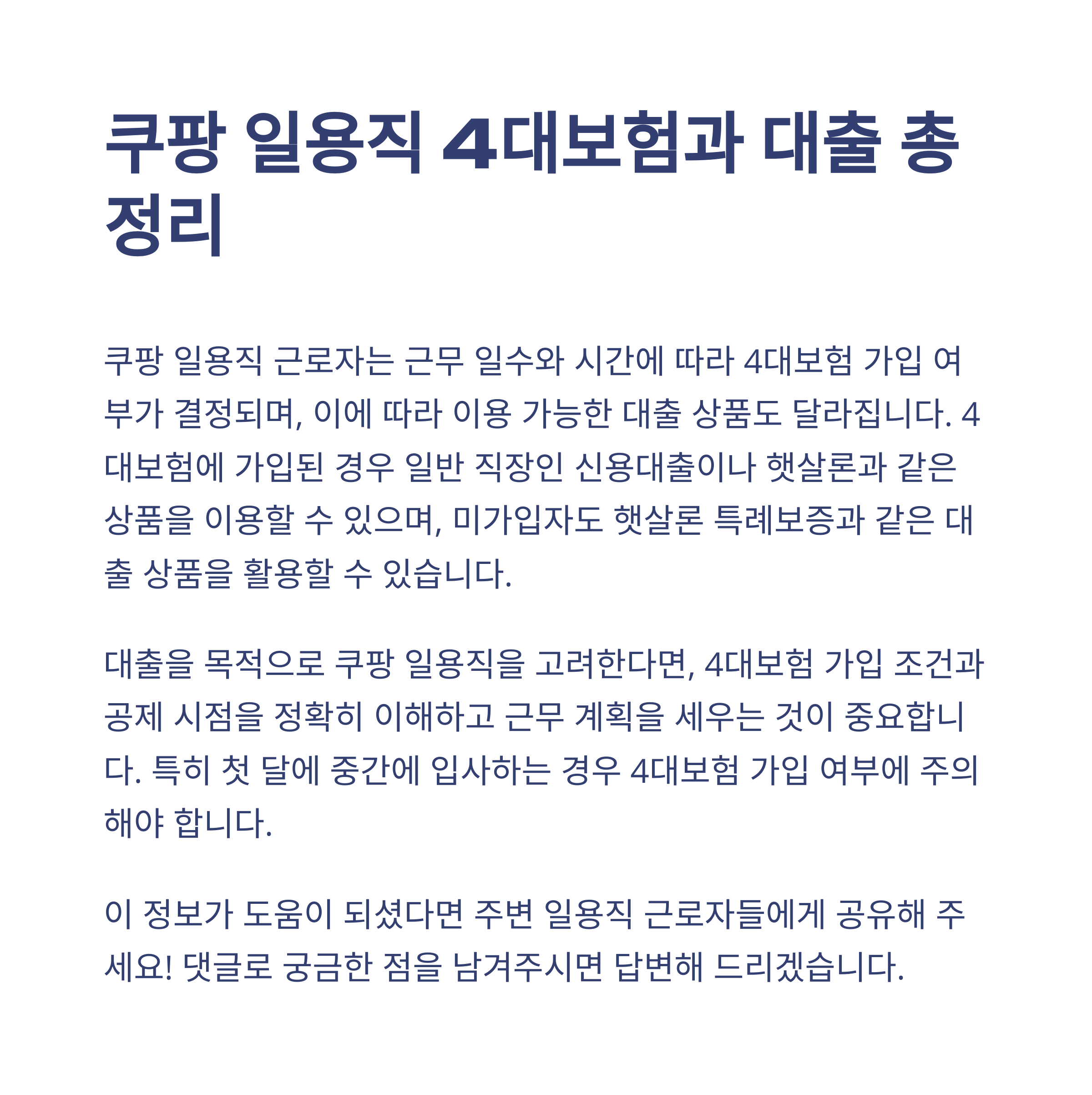 쿠팡 일용직으로 일하면서 겪는 현실적인 고민들, 특히 4대보험과 대출 문제는 진짜 민감하고 중요한 이슈예요. 저도 한때 이 문제로 스트레스를 많이 받았고요. 하지만 정확한 정보를 알게 되면, 생각보다 대처할 수 있는 방법이 많다는 걸 알게 됩니다. 여러분도 이 글을 통해 한 발 더 현명한 선택 하시길 바랄게요. 혹시 궁금한 점 있으시면 댓글이나 DM 주세요. 같이 고민해봐요!