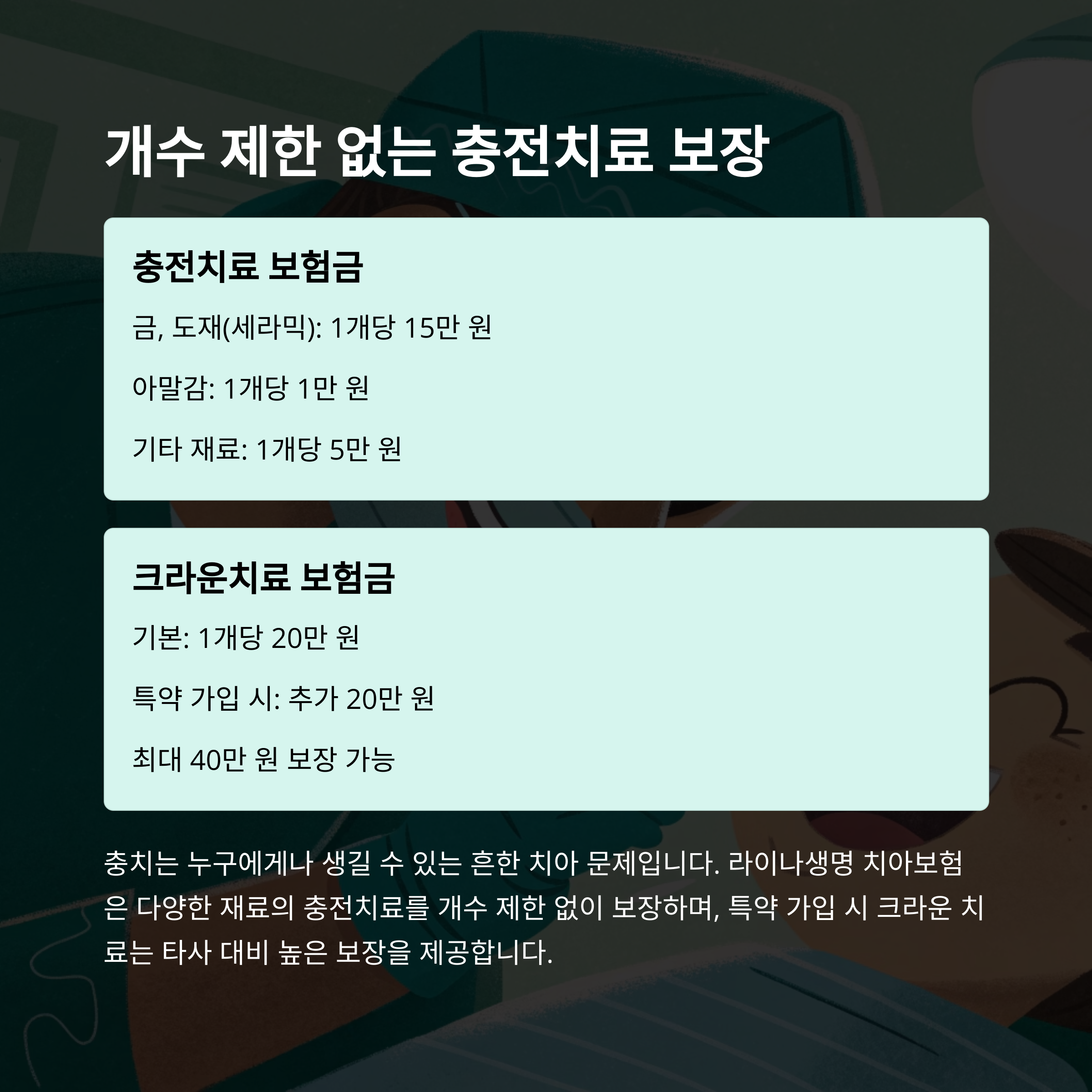 충치 때문에 자주 받는 치료가 바로 충전과 크라운이에요. 라이나는 충전치료는 재료 종류별로 보장을 달리하면서도 개수 제한은 없어요. 특히 크라운은 기본 20만 원, 특약까지 추가하면 40~50만 원까지 보장돼요. 타 보험사와 비교해도 확실히 든든하죠.