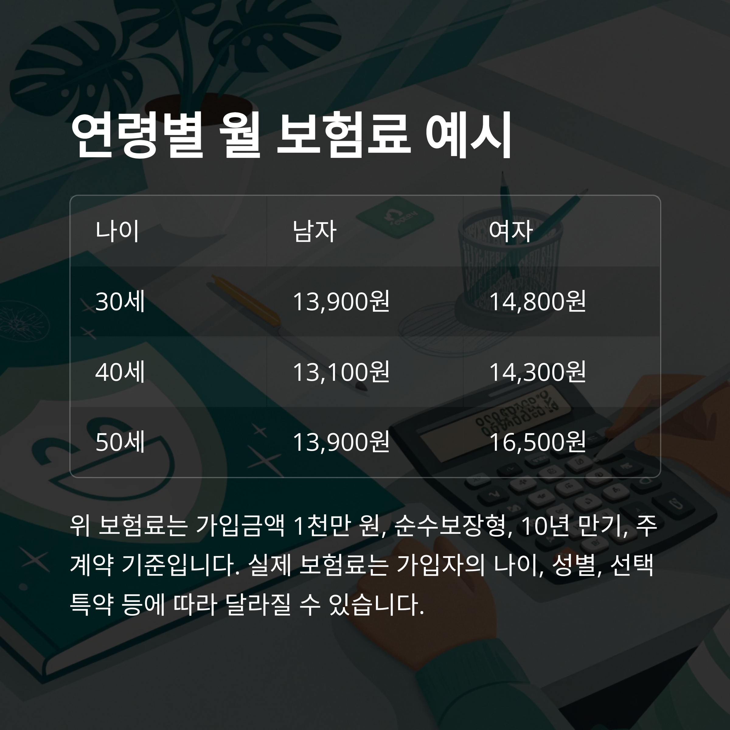 보험료는 연령, 성별, 특약 선택 여부에 따라 달라져요. 아래는 대표 조건(순수보장형, 주계약 기준, 월납 기준)으로 계산된 예시예요. 보시면 30~50대까지 큰 차이는 없지만 여성의 보험료가 조금 더 높다는 것도 참고하시면 좋아요.