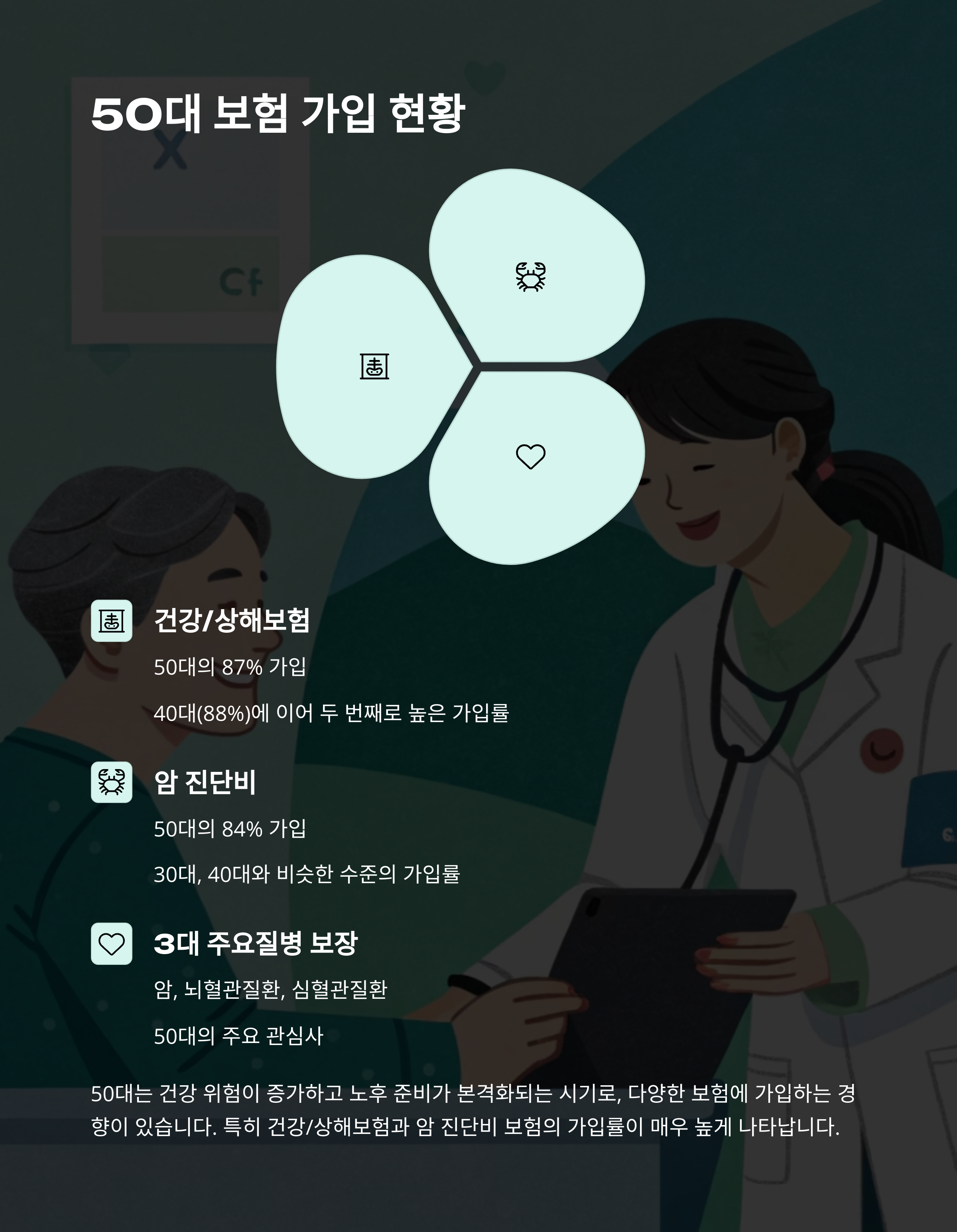 50대는 보험 시장에서 매우 활발한 소비자층이에요. 건강 문제가 본격적으로 걱정되기 시작하고, 은퇴를 준비하면서 ‘혹시 모를 상황’에 대비하려는 심리가 강해지거든요. 실제로 50대는 건강/상해보험 가입률이 87%에 달하며, 암 진단비 보장 상품도 84%가량이 가입되어 있어요. 보험 가입 패턴에서 가장 눈에 띄는 점은 '중복 보장'이 많다는 겁니다. 30~40대 시절 가입한 보험과 현재 필요에 따라 새로 가입한 보험이 겹치기 때문이죠.