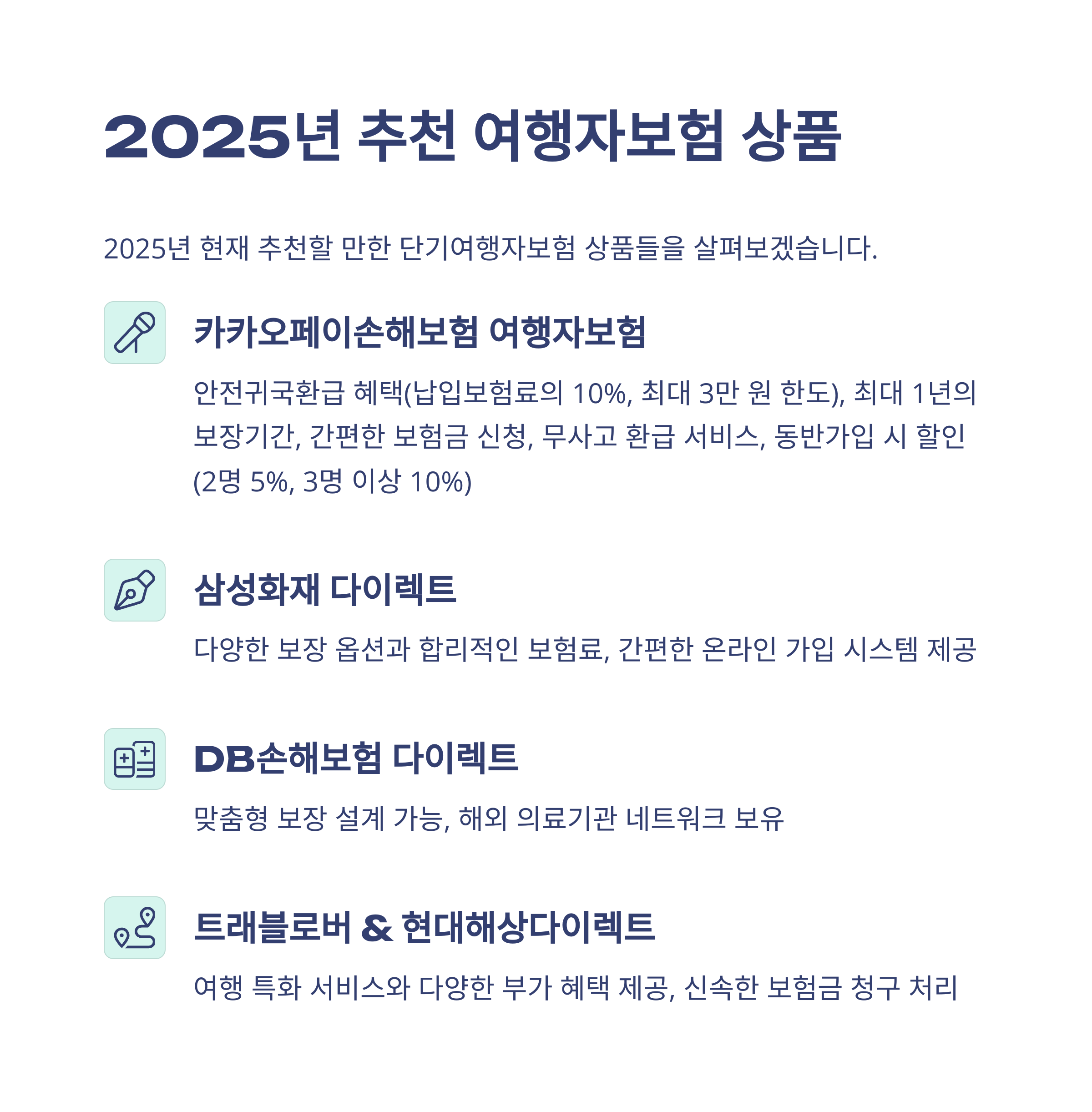 매년 조금씩 보험사별 혜택과 구성도 달라지지만, 2025년 기준으로 ‘안전+보장+편의성’ 세 마리 토끼를 모두 잡은 여행자보험 상품 다섯 개를 엄선했어요. 아래 비교표를 참고해 보세요.