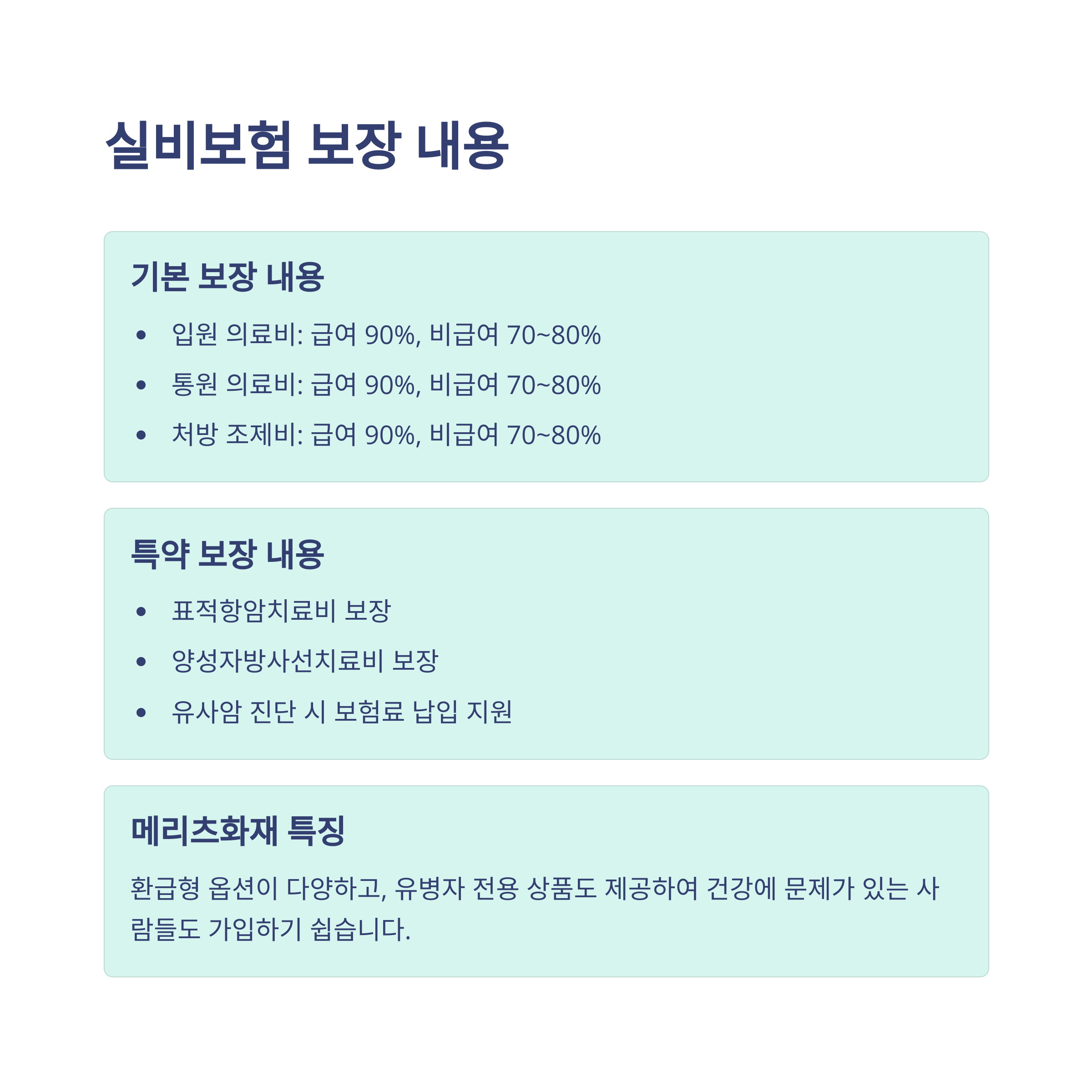 | 입원 의료비 | 급여 90%, 비급여 70~80% 보장 |