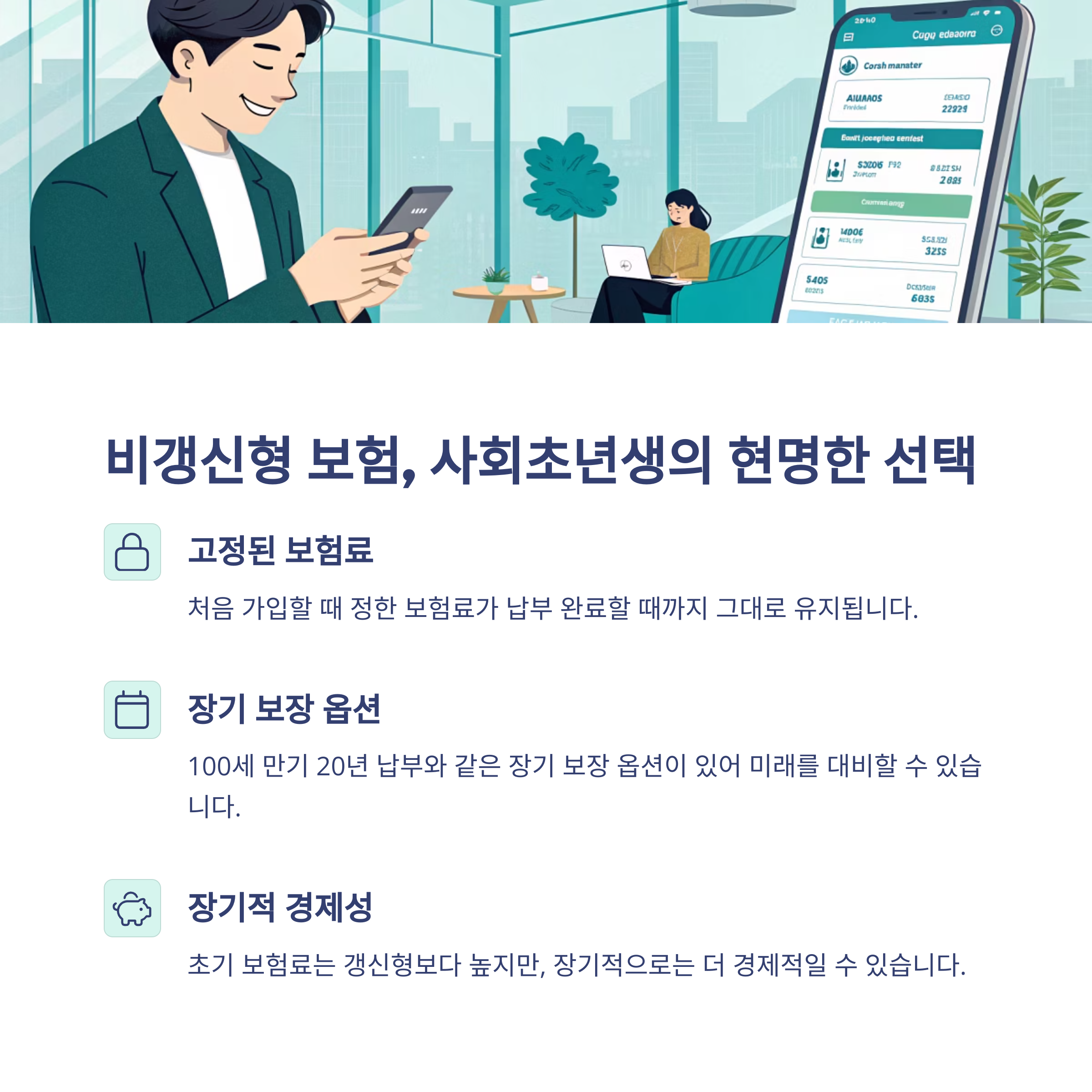 보험 가입할 때 ‘비갱신형’이라는 단어 보신 적 있죠? 굿리치는 사회초년생에게 특히 이 비갱신형 보험을 추천하고 있어요. 이유요? 초반엔 보험료가 조금 높지만, 중간에 갱신될 일이 없으니 장기적으로 훨씬 안정적이거든요.