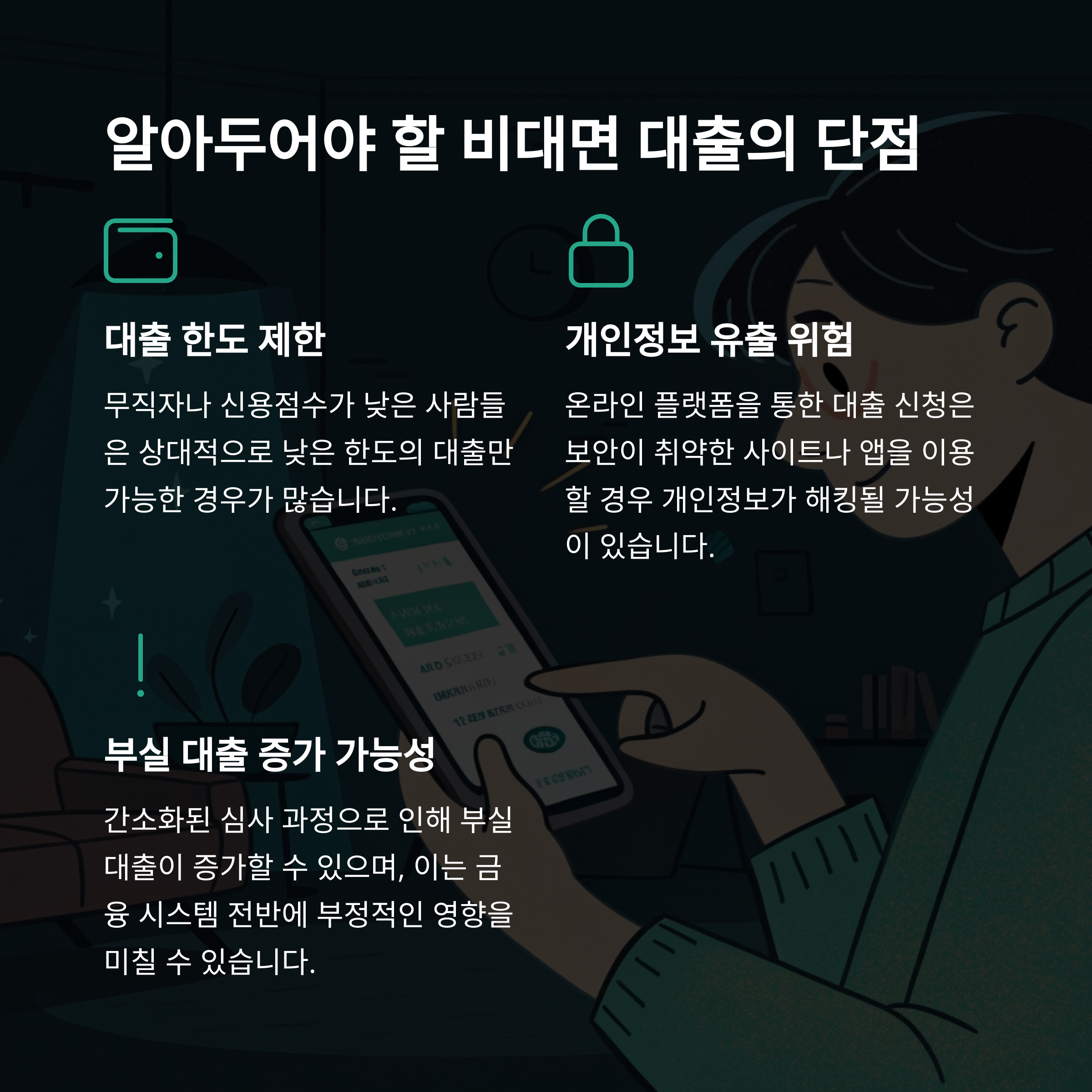 - 대출 조건을 꼼꼼히 확인하고 과도한 금리에 주의하세요.