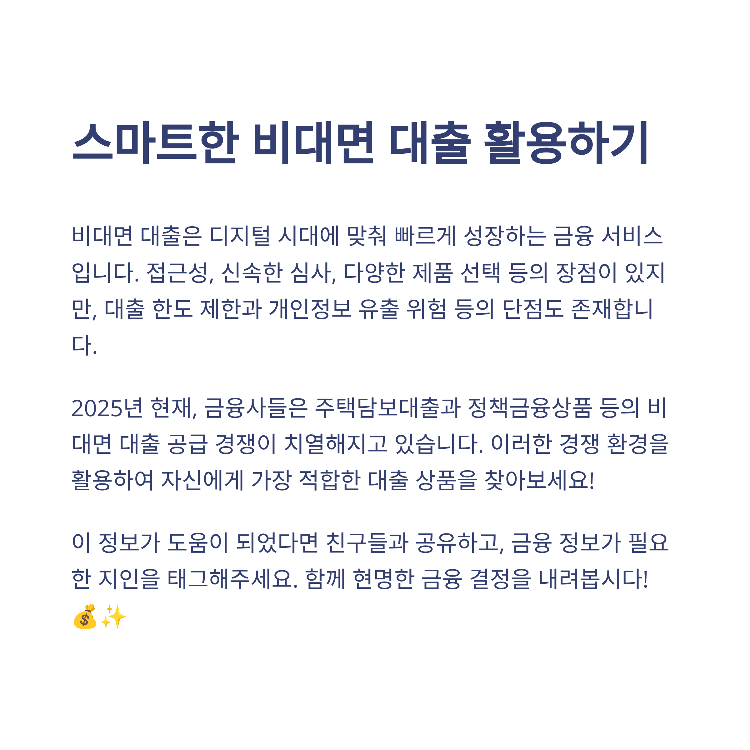 오늘은 2025년 기준으로 비대면 대출에 대해 낱낱이 살펴봤습니다. 변화의 중심에서 우리 삶을 더욱 편리하게 만들어주는 금융 혁신, 여러분도 활용하고 계신가요? 만약 아직이라면, 지금이 바로 시작할 때입니다. 하지만, 편리함 뒤에는 언제나 꼼꼼한 확인과 신중한 선택이 따라야 한다는 점, 절대 잊지 마세요! 혹시 비대면 대출 관련해서 더 궁금한 점이 있다면 댓글로 남겨주세요. 다음 포스팅에서는 ‘금리 인상기에 대출 전략’에 대해서도 다룰 예정이니 많은 기대 부탁드려요 😊